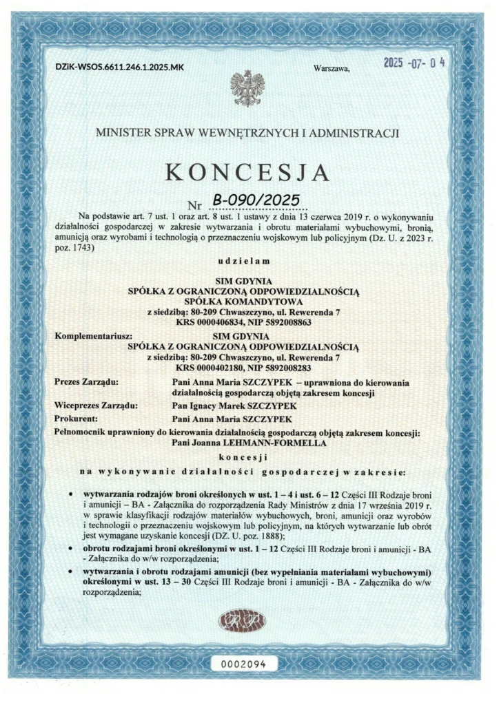 4 lipca uzyskaliśmy koncesję MSWiA (nr B-090/2025) na działalność w zakresie wytwarzania oraz obrotu technologiami o przeznaczeniu wojskowym i policyjnym.