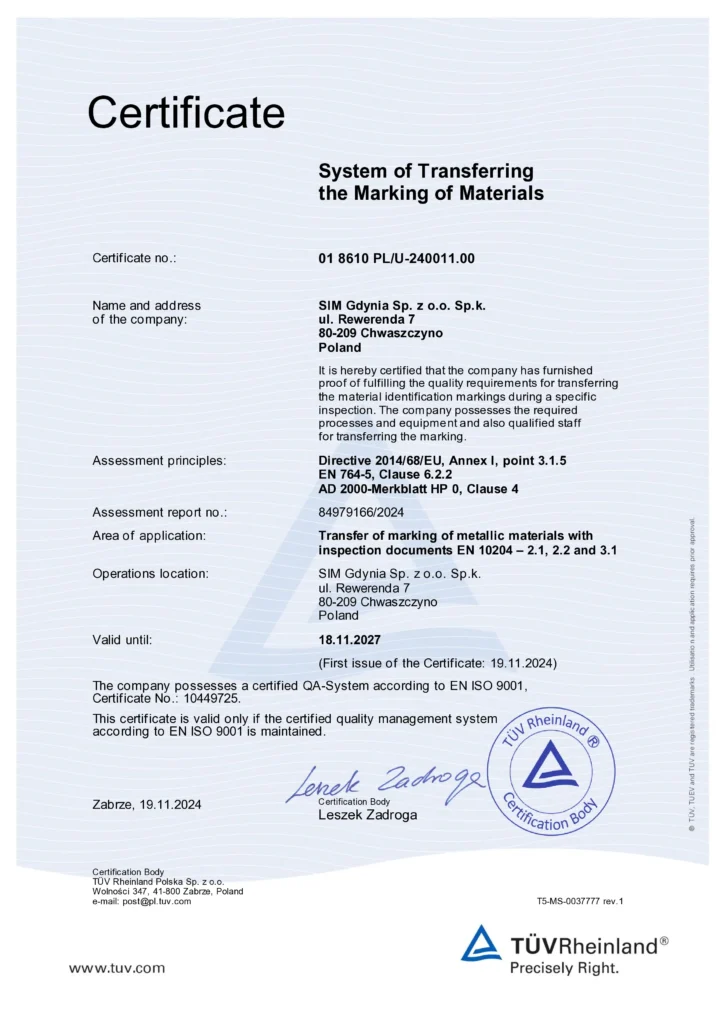 At SIM Gdynia, quality and professionalism are our top priority. We hold certificates that confirm our high production and management standards.